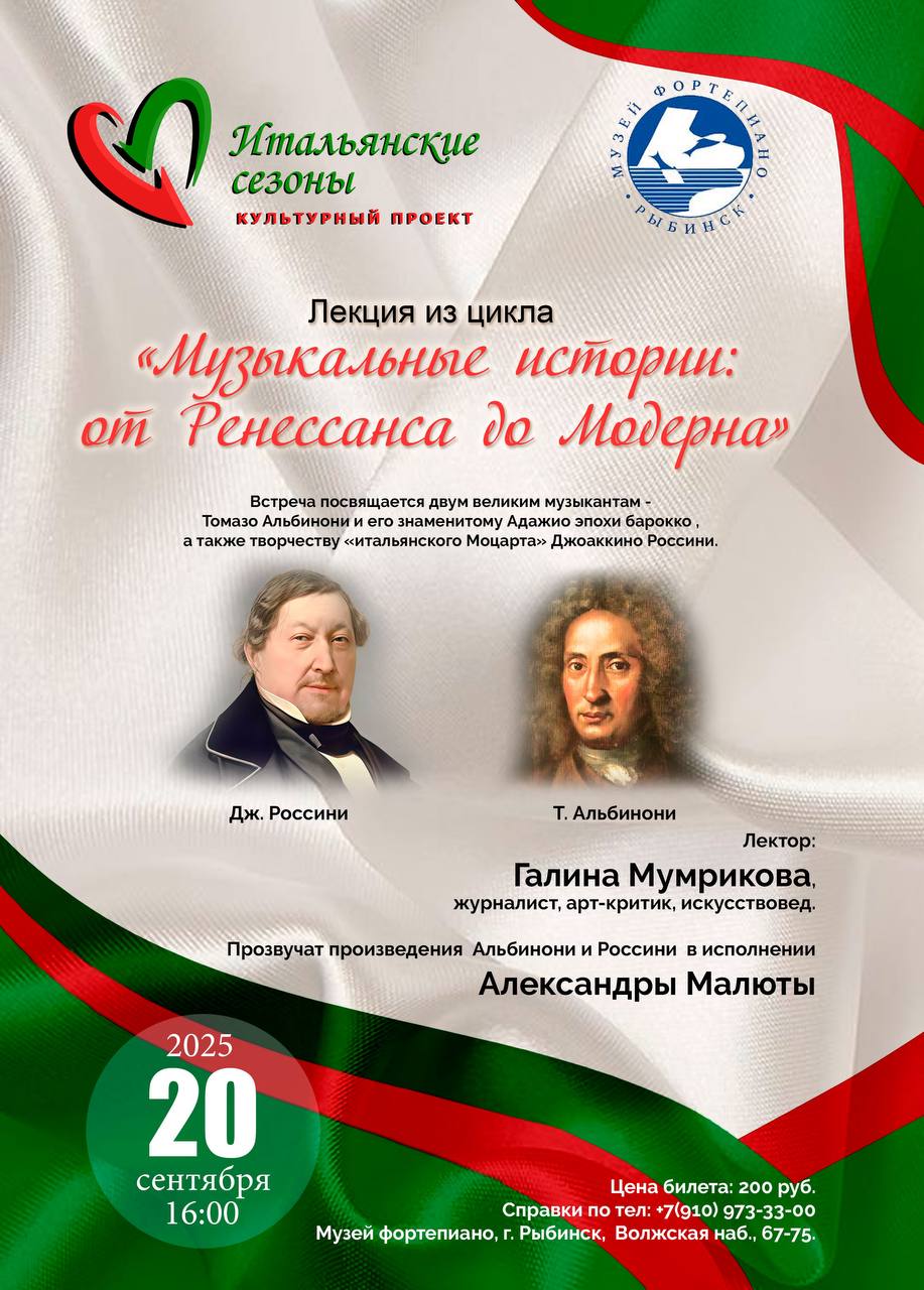 Лекция из цикла «Музыкальные истории: от Ренессанса до Модерна» в рамках в международного культурного проекта "Итальянские сезоны", была посвящена двум великим музыкантам - Томазо Альбинони и его знаменитому Адажио эпохи барокко, а также творчеству «итальянского Моцарта» Джоаккино Россини.