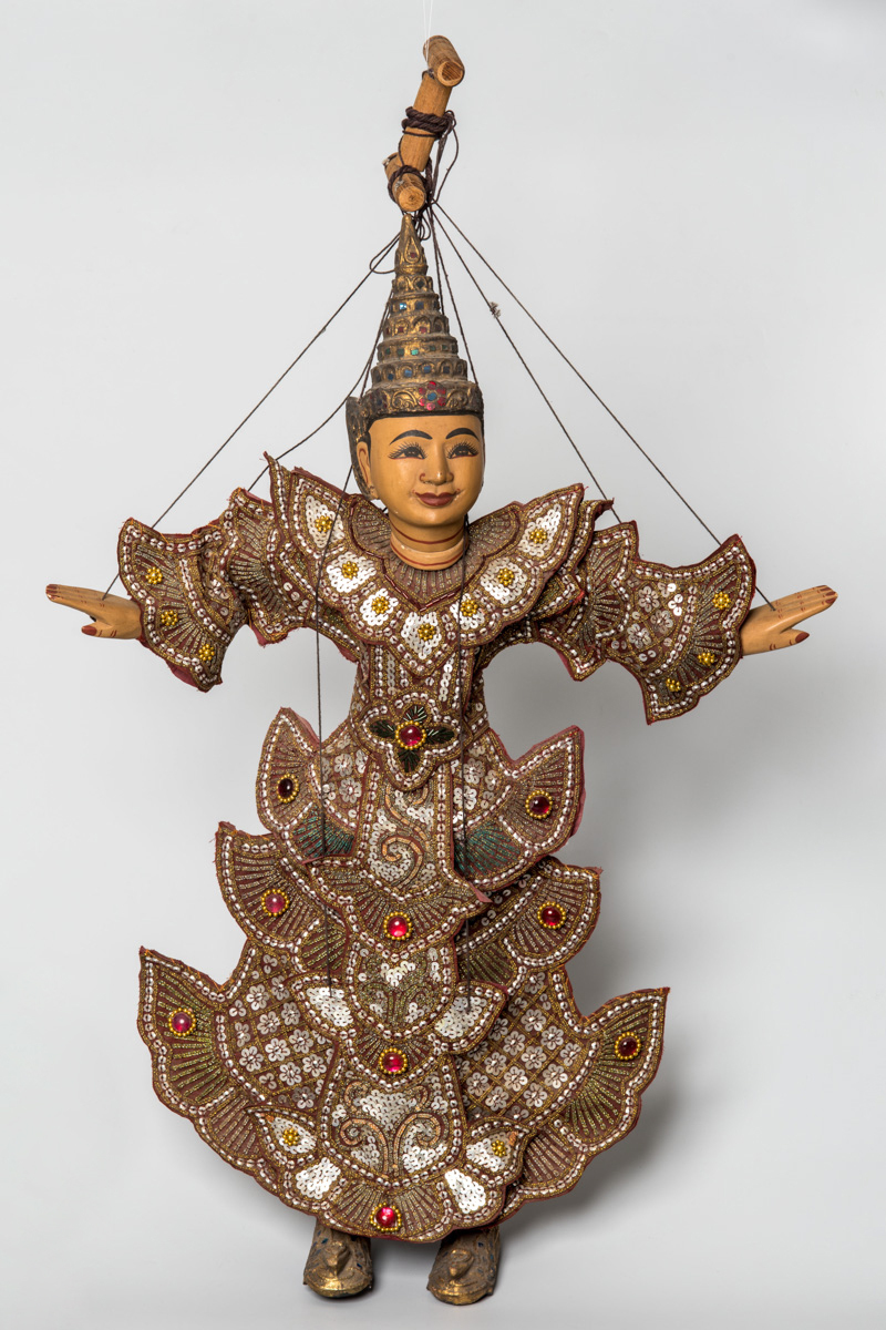 Марионетка Тэчжамина. Мьянма, 2010-е гг. Дерево, ткань, металлизированные нити, пайетки, стекло, веревка, резьба, вышивка, роспись