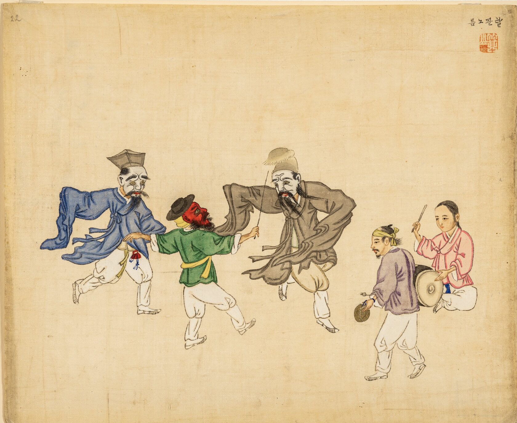 Ким Чунгын. Представление в масках. Альбомный лист. Корея, конец XIX в. Шелк, тушь, краски