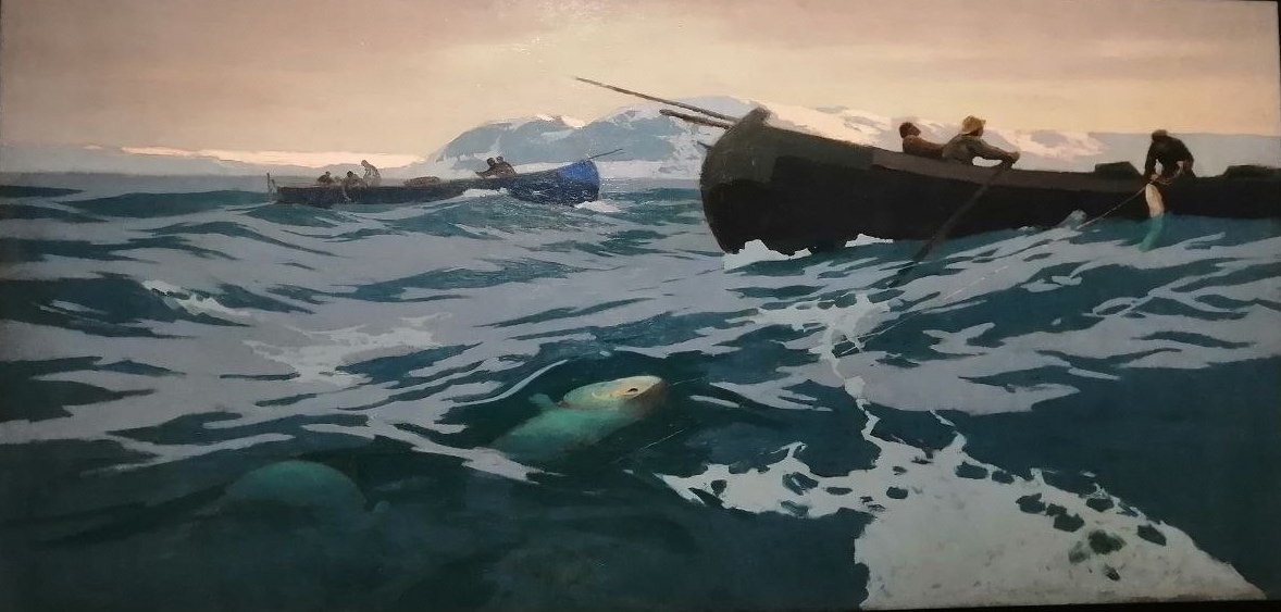 Романтика Севера с давних пор привлекала внимание ученых, путешественников, художников, фотографов. На этой выставке одной из главных «фишек» стало не так давно отреставрированное и впервые после реставрации показанное панно – одно из десяти, написанных Константином Коровиным к Всероссийской промышленно-художественной ярмарке в Нижнем Новгороде 1896 года специально для павильона «Крайний Север». Тогда панно произвело на зрителей очень большое впечатление. Впрочем, не меньше впечатляет и другие работы Мастера, например, «Ловля рыбы в Мурманском море». Коровин был самым главным автором павильона «Крайний Север», который возводился при поддержке Саввы Мамонтова.