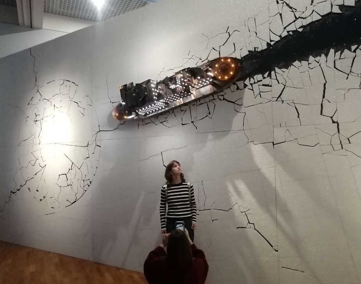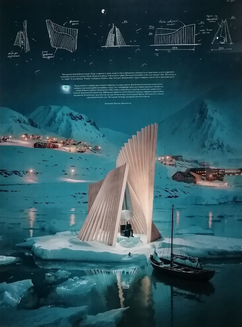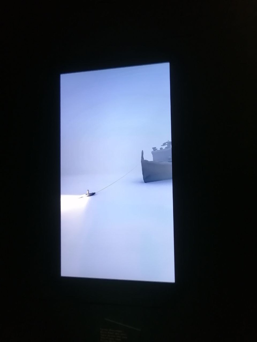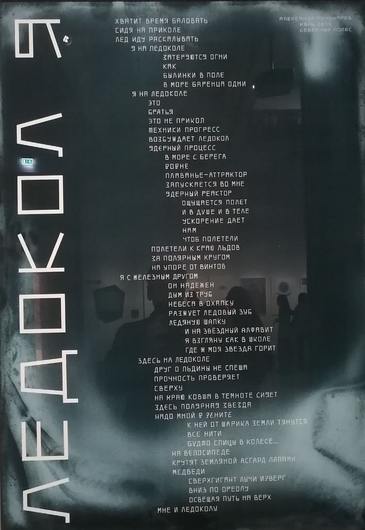 Из современных художников весьма интересный проект сделал специально для выставки Александр Пономарев. Это инсталляция «Ледокол Я». «В ней Северный полюс представлен магической точкой схода географических координата, к которой неудержимо движется гигантское судно. В вертикально развернутом панно из металла и керамики парадоксально сочетаются условно-символические и натуралистические приемы». Замечательная инсталляция! Впечатляет.