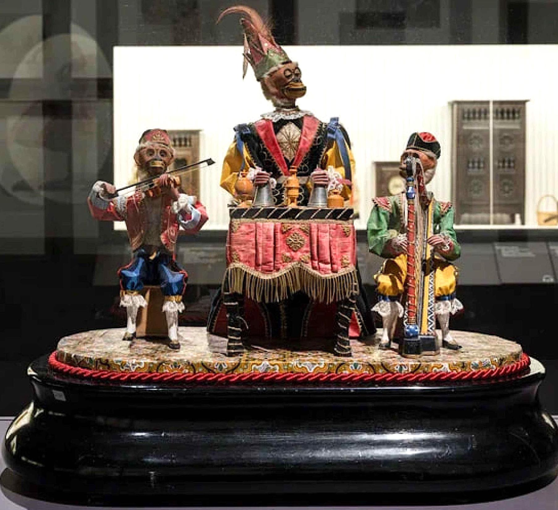В частности, очень интересны механические двигающиеся фигурки людей и животных, так называемые автоматоны. Они известны с глубокой древности, а расцвет их производства приходится на восемнадцатый век. Расширение европейских владений в Африке и Юго-Восточной Азии подогревало интерес к другим культурам. Экзотический облик представителей восточных и африканских народов повлиял и на дизайн автоматонов. На выставке представлен один из таких автоматонов — группа из трех обезьянок в образах фокусников и музыкантов.