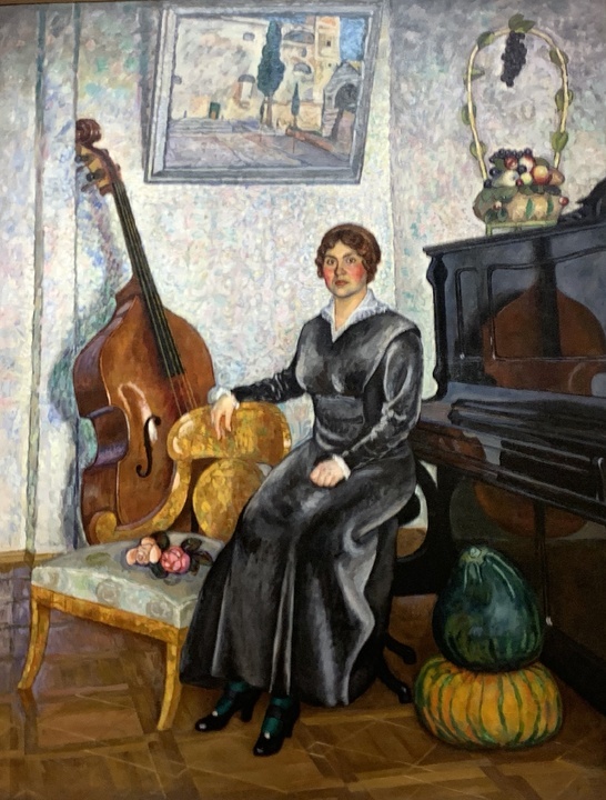 «Дама с контрабасом» (1915 год) – вообще любопытна со всех точек зрения, почти классический портрет да еще и собственная картина на стене. Тут вам и образ, и пейзаж, и натюрморт, и интерьер – всё сразу. Попытайтесь только убрать тыкву на полу или корзину на пианино – и всё рухнет.