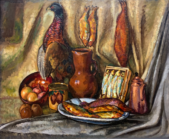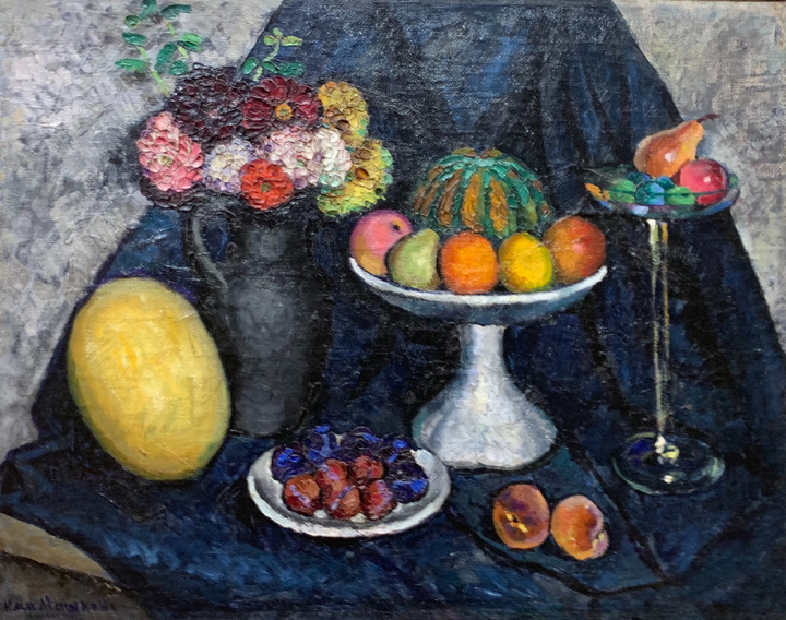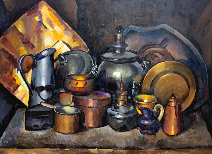 Среди учеников полно знаменитых фамилий: Фальк, Мухина, Лабас, Осьмеркин, Гончаров… О его картинах, например, о натюрмортах с мотивами подноса, об орнаментальном принципе организации предметов искусствоведы понаписали немало диссертаций. А между тем в его фруктах и вазах, дичи и рыбах, фоне – эффект обаяния. Простота подлинная. Можно любоваться мазком, грушей, графином и разглядывать каждый предмет бесконечно. В них свежесть и сочность. Они живые. Художник вчера всё расставил, рассказал ученикам, что тут и как, а сегодня мы смотрим. Неподдельным золотом отливает медная посуда, и эти сказочные жестянки, какие ж они плотные, вечные, красивые. Говорящие.
