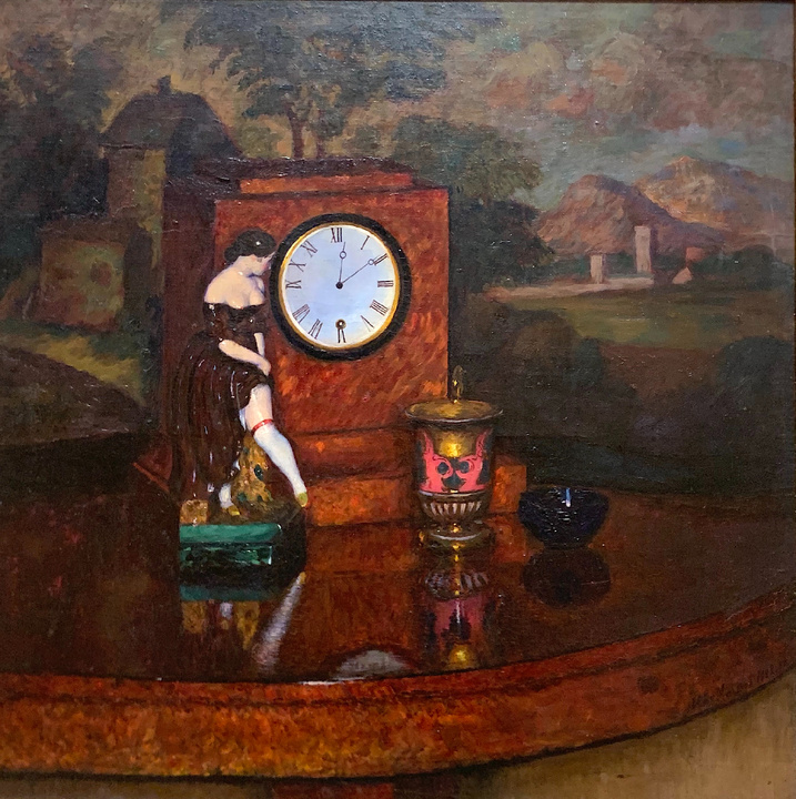 Сочетание натюрморта и пейзажа мы видим на холсте «Натюрморт с фигуркой (Фарфоровая статуэтка и часы) – это в духе Машкова начала 1920-х (экспонировался на художественной выставке картин в 1923 году в Москве).