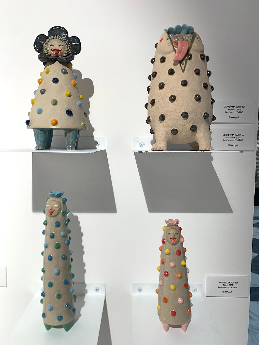 Серафима Сажина, хотя училась в Строгановке на факультете художественной обработки металла, стала тоже из серии «мульти»: занимается и живописью, и керамикой, и металлом, и текстилем, но KGallery показала ее керамику, тем более что в Институте Современного Искусства Иосифа Бакштейна она как раз изучала новые художественные стратегии.